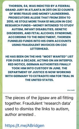 Here you might wonder why I'm faulting the CDC, as the organization was the victim of fraud. The reason I fault them is because they hired Dr. Thorsen to debunk the link between thimerosal in vaccines and autism—which he did to their satisfaction. However, CDC officials may have played a significant role in "guiding" this research to their desired end, and now that Thorsen has been exposed as a fraud, the agency still upholds his research as being of high caliber.....Dr. Thorsen's studies are frequently quoted in rebuttals to the claim that vaccines may play a role in the disorder. The studies in question were riddled with flaws, yet despite the fact that Thorsen's studies may actually be a complete sham, the CDC has not officially declared them invalid. In fact, they're still listed on the CDC website as part of the scientific backing of their stance on autism and vaccine safety.
